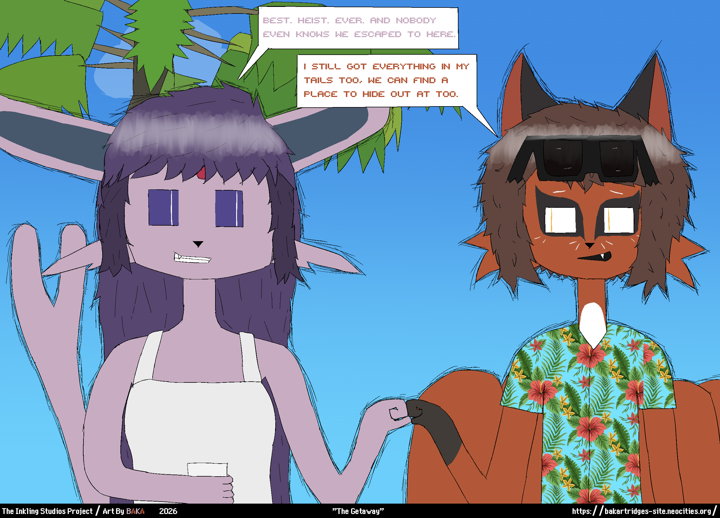Sorta late drawing for Pokemon day (and in celebration of Gen 10's reveal), here's Nebula and Sable celebrating after successfully getting away from a massive heist.